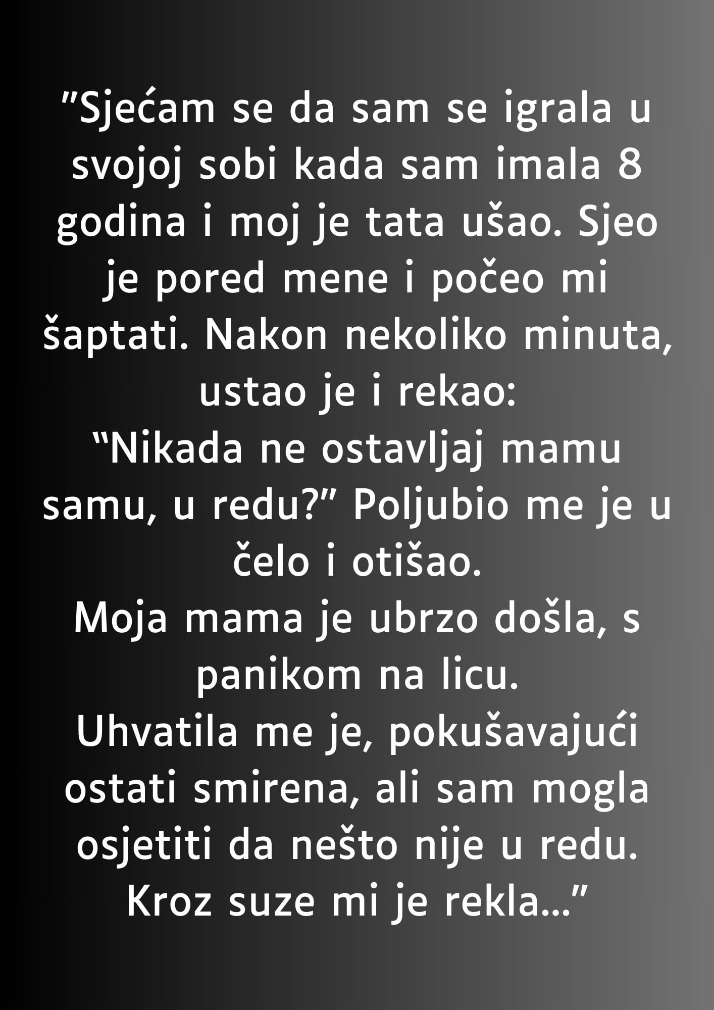 “Pobrinite se da majku nikada ne ostavljate bez nadzora, jasno?” Stavio mi je poljubac u čelo prije nego što je otišao.
