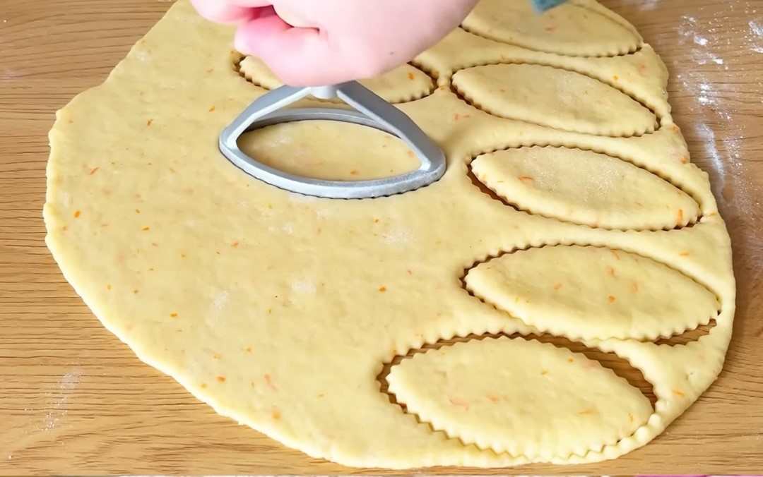 Razvaljajte tijesto na oko 1/2 inča debljine. Koristite rezač za krafne ili dva okrugla rezača različitih veličina za izradu oblika krafne. Ako nemate rezač za krafne, možete upotrijebiti čašu ili kalup za kekse da napravite okrugli oblik, a manjim rezačom ili čepom za bocu uklonite središnji otvor.