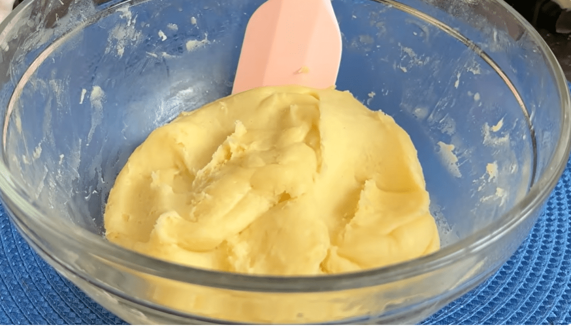 Nakon što se tijesto malo ohladi, umiješajte 2 jaja, dodajući ih jedno po jedno i dobro miješajte nakon svakog dodavanja dok smjesa ne postane glatka i potpuno sjedinjena. 4.