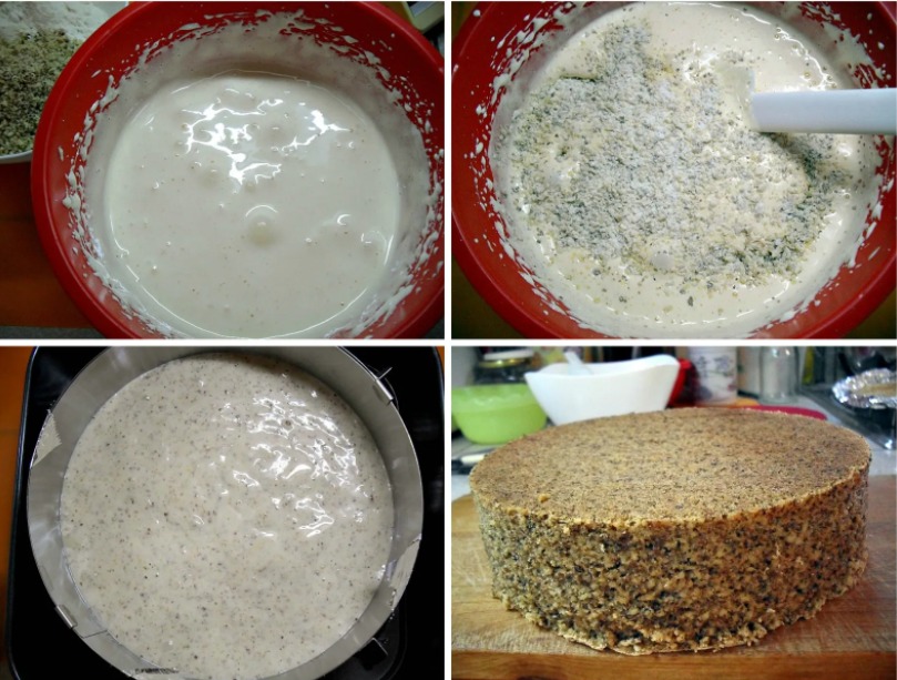 Koristila sam okrugli prsten s podesivim stranicama za pečenje kolača, odlučila sam da ga ne mažem. Na dno sam stavila zgužvanu foliju koju sam pričvrstila za obruč i stavila u pleh koji je služio kao podloga. Ova metoda osigurava da tijesto nakon pečenja ostane čvrsto, što rezultira ravnom površinom biskvita (patišpanja). Kad je pečeno, samo sam nožem podrezala rubove, okrenula i lagano skinula foliju.