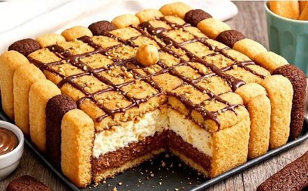 Na kremu poslažite red klasičnih keksa lagano umočenih u mlijeko. Preko biskvita premažite običnu mascarpone kremu. Dodajte još jedan sloj keksa, opet naizmjenično mijenjajući boje radi kontrasta. Rubove biskvita presavijte prema unutra da zatvorite vrh. Stavite tortu u hladnjak da se ohladi najmanje 2 sata.