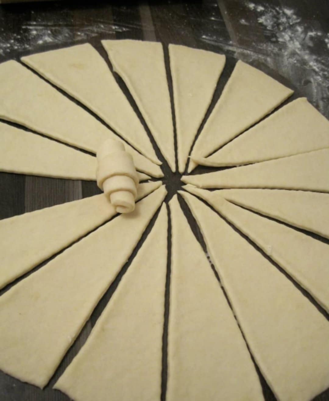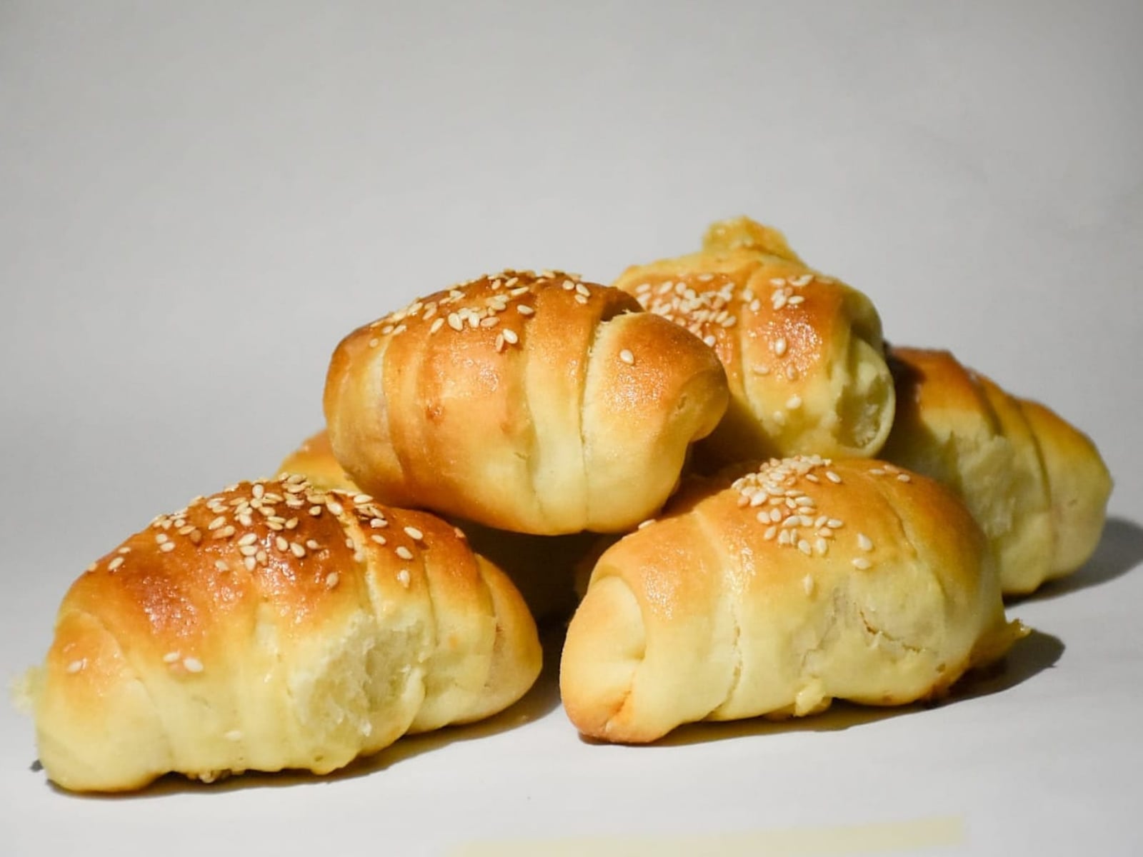U mlijeko dodajte suhi kvasac i šećer, a zatim uključite sve preostale sastojke i temeljito umijesite tijesto rukama. Dobit ćete čvrsto tijesto koje je prikladno za rad. Podijelite tijesto na dva dijela i odmah započnite s radom. Pomoću oklagije razvaljajte jufku u obliku kruga. Molimo vas da isječite na trokutove prema vlastitim željama, bilo da preferirate manje ili veće komade. Isto napraviti i sa drugim tijestom. Ako preferirate prazne ili punjene, izbor je potpuno vaš. Premažite ih žumanjkom i pospite susamom prije nego što ih stavite u pećnicu. Pecite ih u prethodno zagrijanoj rerni na 180° otprilike 20 minuta. Uključite pećnicu tek nakon što ste završili s pripremom peciva.