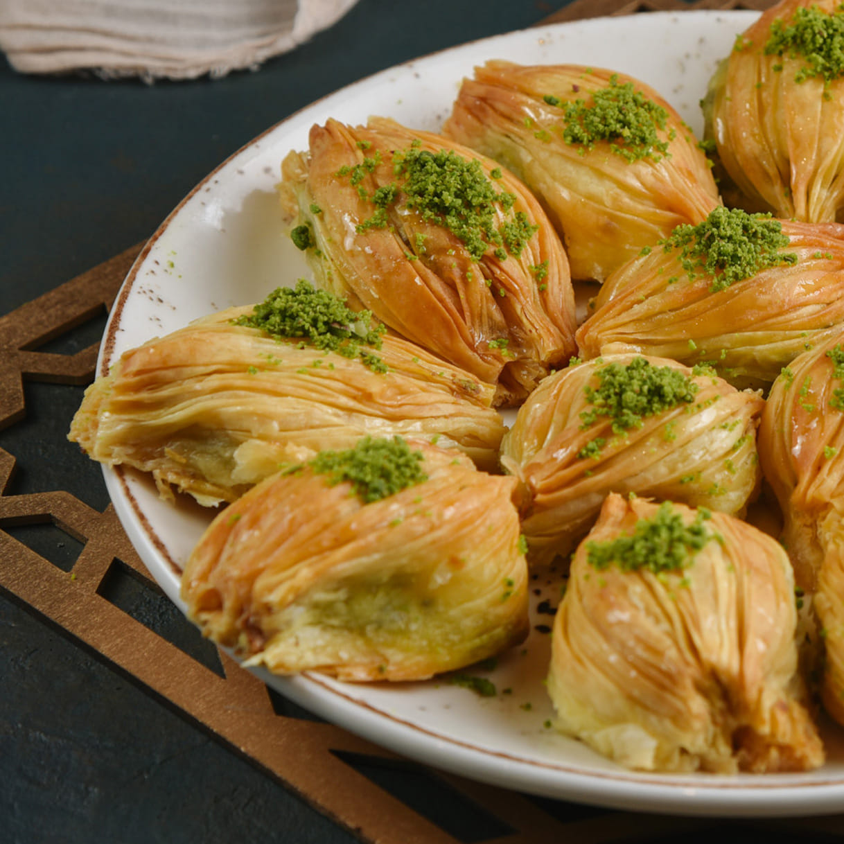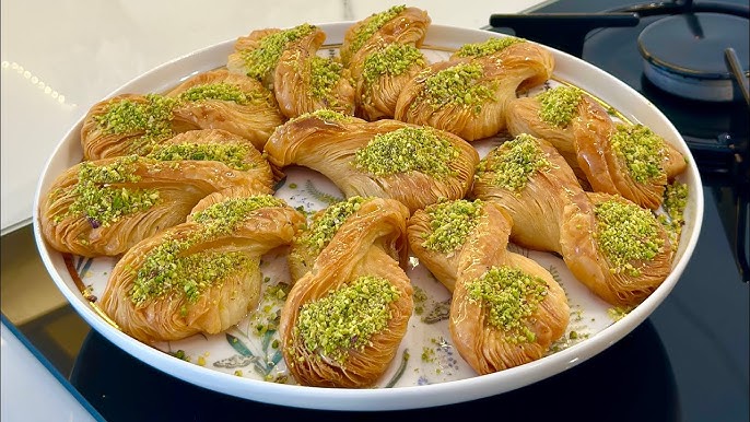 Započnite kombiniranjem svih sastojaka za sirup, kuhajući smjesu 20 minuta prije nego što je ostavite da se ohladi. Pomiješajte sve sastojke za tijesto da dobijete meku konzistenciju koja se ne lijepi za ruke. Od ovog tijesta oblikujte 12 kuglica i uvaljajte ih u pšenični škrob do promjera desertnog tanjura. Slažite kuglice jednu na drugu, pazeći da svaki sloj pospete škrobom. Pokrijte hrpu i ostavite da odstoji 20 minuta. Nakon odmora, cijelo tijesto spljoštite u oblik kvadrata, čvrsto zarolajte, a zatim koso prerežite. Svaki segment oblikujte kao što je prikazano u videu tako da držite komad tijesta uspravno, pritisnete oba kraja u suprotnim smjerovima i razvaljate ga valjkom za tijesto. Oblikovane komade stavite na lim za pečenje, premažite ih mješavinom maslaca i ulja i pecite u prethodno zagrijanoj pećnici na 280 stupnjeva 40-45 minuta dok ne poprime bogatu zlatnosmeđu boju, pazeći da se srednji slojevi odvoje i dobro ispeku. Nakon što izvadite iz pećnice, ostavite desert da odstoji 5-10 minuta prije nego što ga prelijete hladnim sirupom. Nakon što se sirup upije, obilato pospite pistaćima ili lješnjacima i poslužite. Uživajte u obroku.