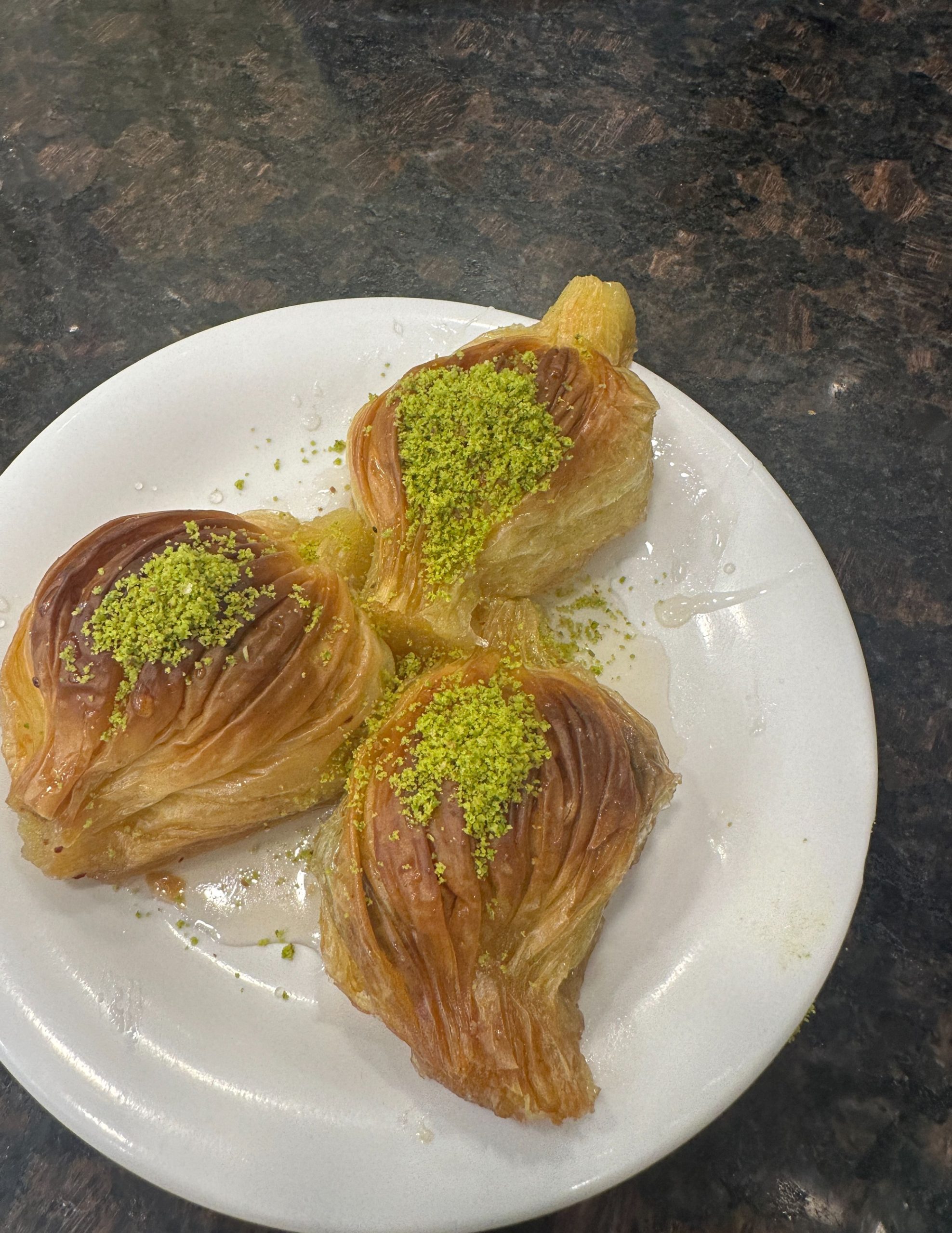 Započnite kombiniranjem svih sastojaka za sirup, kuhajući smjesu 20 minuta prije nego što je ostavite da se ohladi. Pomiješajte sve sastojke za tijesto da dobijete meku konzistenciju koja se ne lijepi za ruke. Od ovog tijesta oblikujte 12 kuglica i uvaljajte ih u pšenični škrob do promjera desertnog tanjura. Slažite kuglice jednu na drugu, pazeći da svaki sloj pospete škrobom. Pokrijte hrpu i ostavite da odstoji 20 minuta. Nakon odmora, cijelo tijesto spljoštite u oblik kvadrata, čvrsto zarolajte, a zatim koso prerežite. Svaki segment oblikujte kao što je prikazano u videu tako da držite komad tijesta uspravno, pritisnete oba kraja u suprotnim smjerovima i razvaljate ga valjkom za tijesto. Oblikovane komade stavite na lim za pečenje, premažite ih mješavinom maslaca i ulja i pecite u prethodno zagrijanoj pećnici na 280 stupnjeva 40-45 minuta dok ne poprime bogatu zlatnosmeđu boju, pazeći da se srednji slojevi odvoje i dobro ispeku. Nakon što izvadite iz pećnice, ostavite desert da odstoji 5-10 minuta prije nego što ga prelijete hladnim sirupom. Nakon što se sirup upije, obilato pospite pistaćima ili lješnjacima i poslužite. Uživajte u obroku.