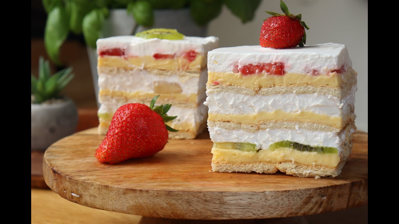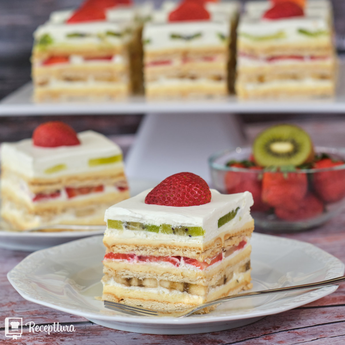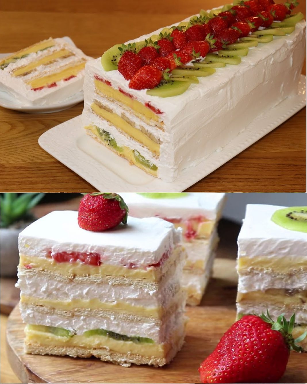 Mikserom sjedinite šlag, a voće narežite na tanke kolutove. Sada je pravi trenutak da date svoje odobrenje. Uzmite kekse namočene u mlijeko i redajte u kalup veličine 20×35 cm. Slažite kremu, zatim red voća, pa još jedan sloj šlaga. Ponovite ovaj niz još dva puta. Na kraju tortu ukrasite preostalim voćem i stavite u hladnjak da se ohladi.