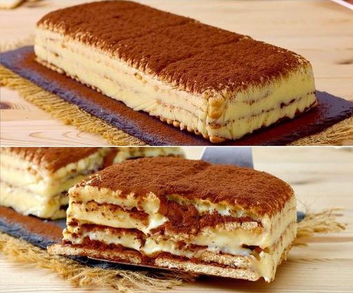 Za početak napravite sloj namočenog keksa, zatim dodajte sloj kreme, pa sloj prosijanog gorkog kakaa. Nastavite s ovim postupkom dok ne dobijete 4 ili 5 slojeva. Stavite u hladnjak na najmanje 2 sata.