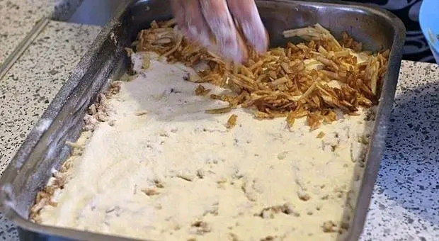 Započnite premazivanjem podloge kalupa uljem i posipanjem brašnom kako se kolač ne bi zalijepio. Zatim rukama ravnomjerno rasporedite suhu smjesu griza, šećera i brašna po cijeloj površini. Pazite da ovaj sloj bude dovoljno tanak da prekrije dno, a da ne bude toliko debeo da zaklanja dno posude.