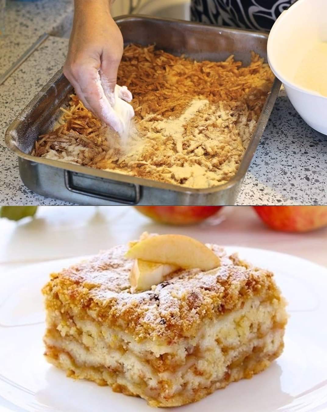 Nastavite s postupkom dok ne potrošite zalihe jabuka i suhih sastojaka, odnosno dok se tava ne napuni. Na kraju preko kolača naribajte margarin i stavite ga peći na 200 stupnjeva oko 40 minuta, odnosno dok ne dobije lijepu zlatnu boju.