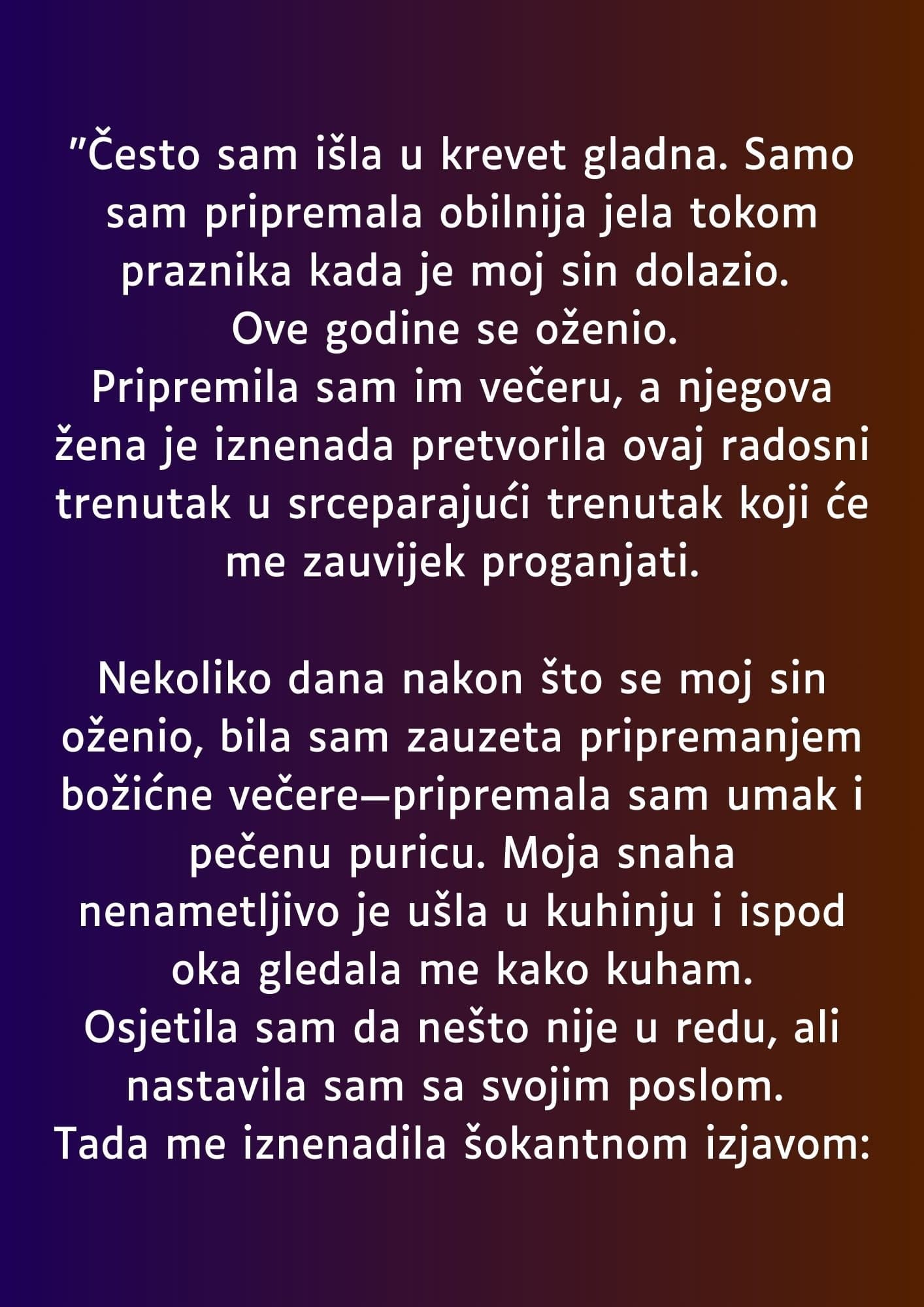 Nekoliko dana nakon sinovog vjenčanja našla sam se u kuhinji, fokusirana na pripremu večere koja je uključivala pečenu puricu i umak. Moja je snaha tiho ušla u kuhinju i iz daljine me promatrala dok sam kuhala.
