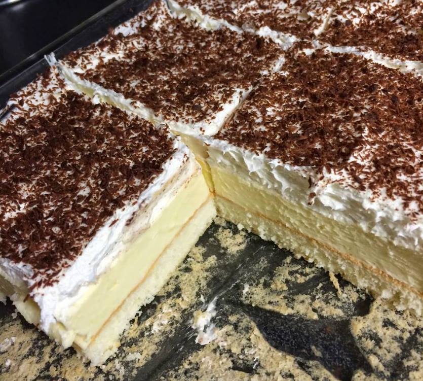 Kad se biskvit ohladi treba ga probosti čačkalicom pa dodati 1 dcl mlijeka i malo ruma. Za kremu dobro izmiksati žumanjke, brašno, šećer, gustin i 1 dcl mlijeka. Ovu smjesu ulijte u 7 dl zagrijanog mlijeka i kuhajte 5 minuta, slično kao kod pripreme pudinga.