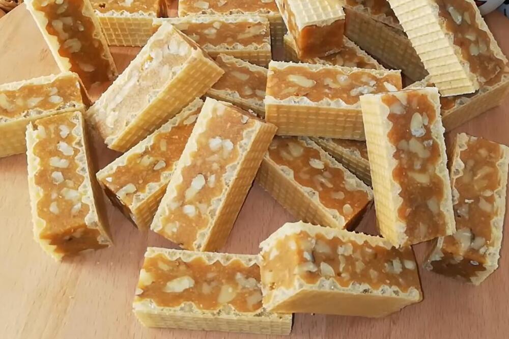 Pažljivo izlijte smjesu na oblatnu, pazeći da je stavljena na onu stranu na kojoj su veći kvadrati, a zatim je poklopite dodatnom oblatnom.