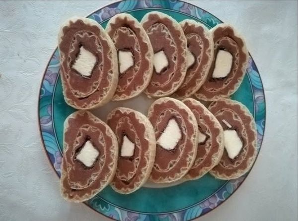 Stavite oblatnu na nekoliko minuta između dvije kuhinjske krpe koje ste dobro navlažili (poželjno je odložiti oblatnu prije pripreme smjese za punjenje). Na pari otopite margarin, šećer, čokoladu i jaje, pa umiješajte mljeveni keks i sve sjedinite. Prvo topao sloj namazati na oblatnu. Zatim kremu od banane (ili cokolade) dodati s jedne strane pa na rub oblatne zarolati prema sredini. Nakon toga stavite u hladnjak da se stegne i narežite na komade. Ova količina je dovoljna za dvije veće oblatne.