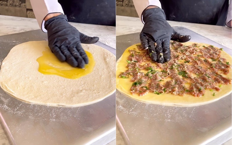 Nakon što tijesto odstoji, svaki komad razvaljajte na veličinu malo veću od tanjura. Na svaki razvaljani sloj tijesta ravnomjerno nanesite dio masne smjese, a zatim dodajte pripremljeni nadjev. Slojeve stavljajte jedan na drugi, a između svakog sloja ponovo dodajte uljnu smjesu i meso. Kada su svi slojevi složeni, ostavite ih da odmore još 10 minuta. Za posljednji korak, nježno razvucite rubove pite rukama kako bi tijesto bilo što tanje, a zatim ga oblikujte u pravokutni paket. Premažite preostalom masnoćom i ostavite da odstoji još 10 minuta. Pitu prebacite na prethodno namašćen pleh i pecite u prethodno zagrijanoj pećnici na 190 stepeni. Važno je napomenuti da pečenje pite na pravoj temperaturi osigurava da tijesto postane zlatno smeđe i hrskavo, dok se nadjev dobro skuva. Preporučuje se i povremeno provjeravanje pite tokom pečenja, kako biste bili sigurni da ne izgori.