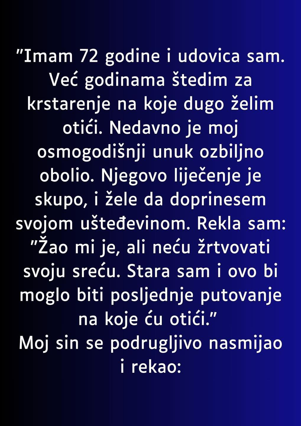 U 72. godini života ostala sam udovica. Dugi niz godina marljivo sam štedjela za krstarenje na koje sam dugo željela krenuti. Međutim, moj osmogodišnji unuk nedavno je teško obolio.