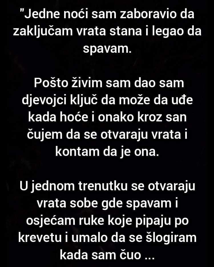 Jednom sam prilikom propustio osigurati vrata stana prije no što sam otišao prespavati. Kako živim sam, djevojci sam dao ključ, dopuštajući joj pristup kad joj odgovara. Dok sam spavao, osjetio sam zvuk otvaranja vrata i instinktivno prepoznao da je to ona.