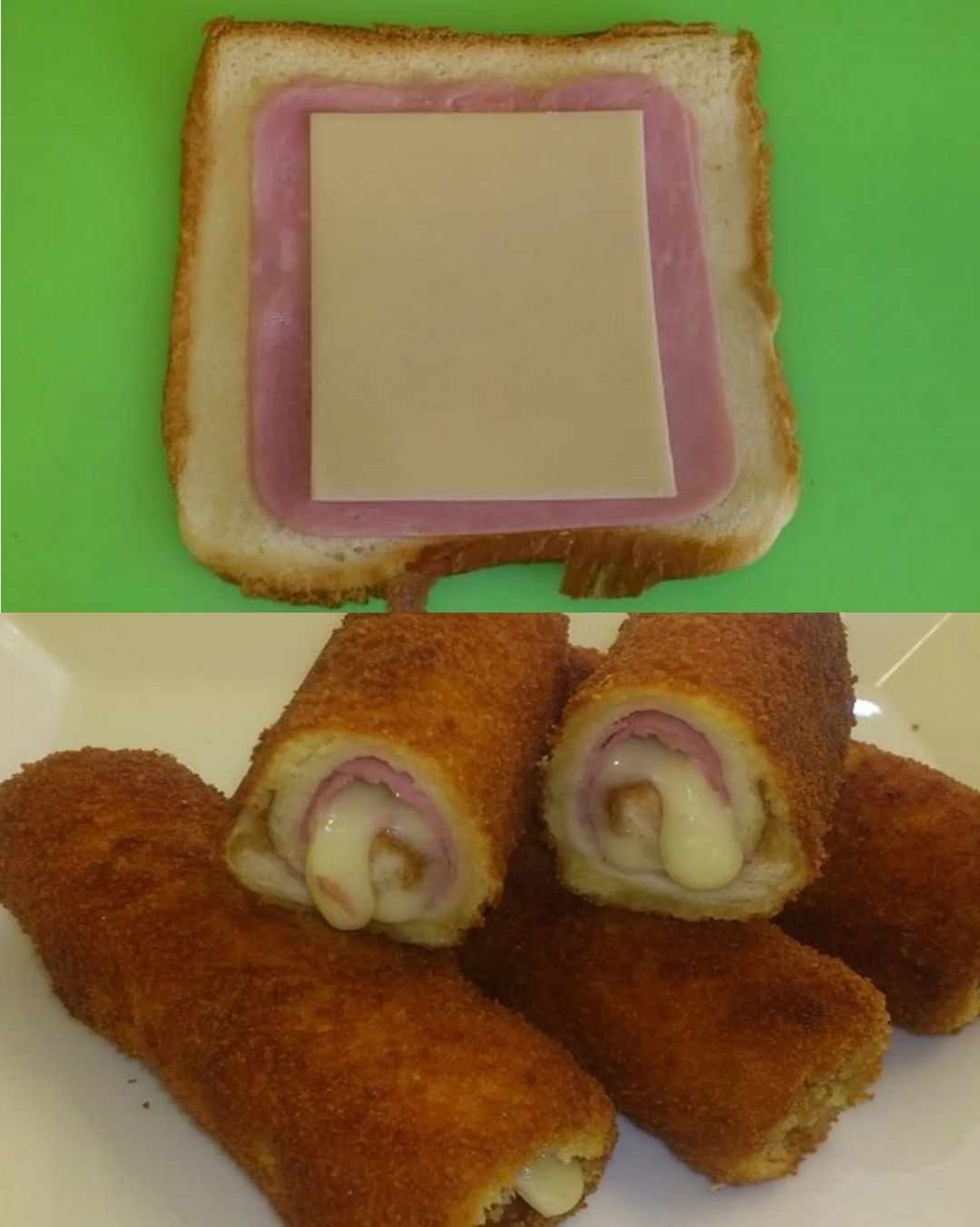 Oklagijom poravnajte sendvič tost. Na svaki komad tosta stavite krišku sira i šunke pa ih lagano zarolajte. Šunku možete zamijeniti salamom ili američkom slaninom ili čak kombinirati šunku i slaninu, ovisno o želji.