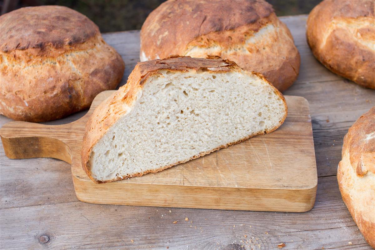 U posudi pomiješajte brašno pa do vrha prelijte toplom vodom. Zatim umiješajte maslinovo ulje, suhi kvasac i sol. Pomiješajte sve sastojke i počnite rukama mijesiti tijesto. Nakon što je tijesto formirano, ostavite ga da se diže u poklopljenoj posudi jedan sat. Nakon sat vremena premjestite tijesto na radnu površinu i oblikujte ga u cilindričan oblik. Podijelite ga na tri dijela i od svakog napravite pogaču. Tijesto se razvalja i zatim umota da se oblikuje kruh. Nakon toga poređajte pogačice na pleh obložen papirom za pečenje, odrežite vrh i pospite brašnom. Pecite u pećnici zagrijanoj na 200°C oko 30 minuta.