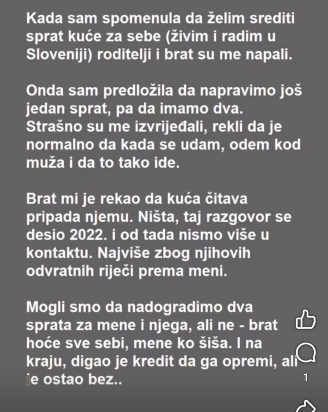 Moj brat je zahtijevao isključivo vlasništvo nad cijelom kućom. Taj razgovor se dogodio 2022. godine i od tada nismo komunicirali, prvenstveno zbog njihovih podlih opaski na moj račun.
