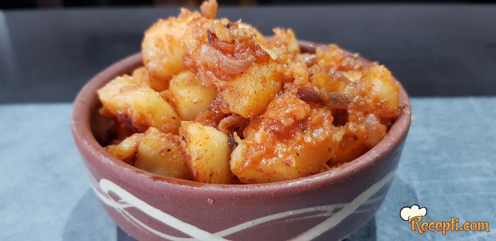 Počnite s guljenjem krumpira i kuhanjem cijelog. Kad je kuhan, krumpir nasjeckajte na kockice. Luk narežite na rebarca. U dubljoj tavi zagrijte ulje i na srednje jakoj vatri dinstajte luk dok malo ne požuti. Zatim umiješajte kuhani krumpir, piment i začinite solju, paprom i suhim začinskim biljem. Miješajte smjesu 2 minute na srednjoj temperaturi.