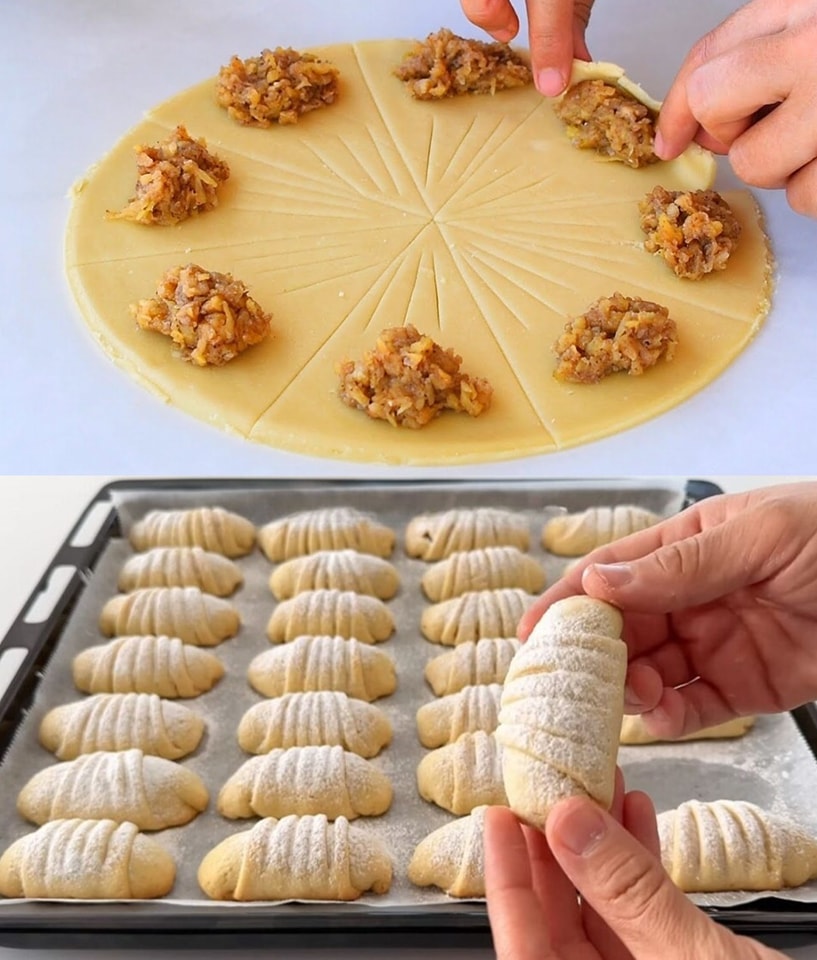 Početni dio tijesta stavite između dva lista papira za pečenje i valjkom za tijesto poravnajte. Pritišćući poklopac lonca na tijesto, nožem ga možemo rezati na jednake dijelove, tako da dobijemo 8 jednolikih komada. Zatim po tijestu napravimo izreze, dodamo nadjev i zarolamo.