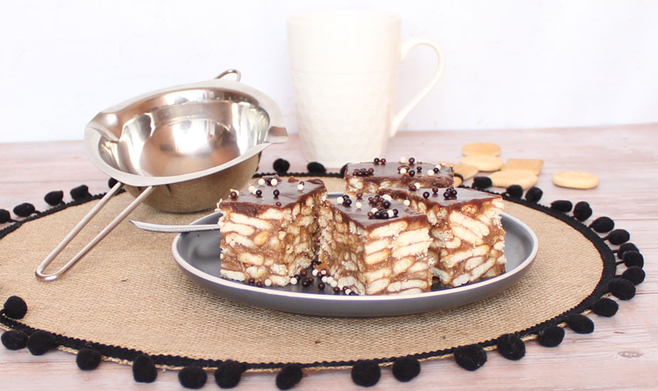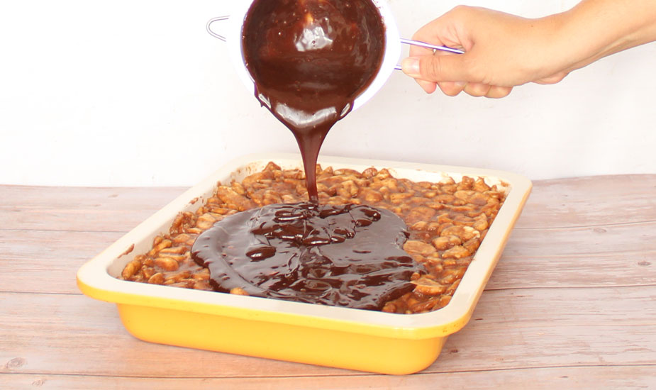 Dok se smjesa hladi, pripremite veći kalup (dimenzija otprilike 25×35 cm) i malo ga nauljite. Istresite pripremljenu smjesu s keksima u kalup i poravnajte površinu. Ostavite kolač na sobnoj temperaturi da se hladi, a dok to traje, možete pripremiti čokoladni preljev koji će dati poseban pečat vašem kolaču. Ova faza dodaje dodatnu složenost i bogatstvo okusa, čineći kolač još privlačnijim za sve ljubitelje slastica.