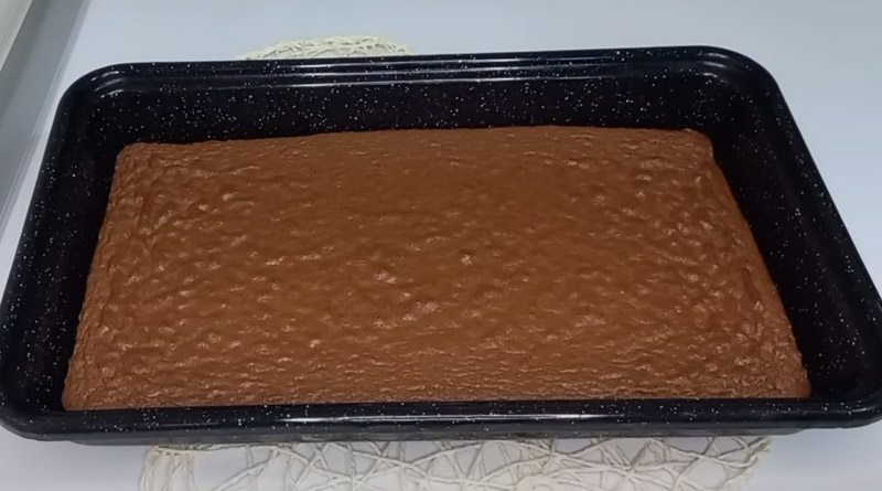 Mikserom umutiti 5 bjelanjaka u čvrst snijeg. Umiješajte šećer i miješajte dok se potpuno ne otopi. Zatim ubacite žumanjak i nastavite još kratko mutiti. Na kraju umiješajte brašno i kakao lagano miješajući mikserom. Smjesu prebacite u veći namašćeni pleh i pecite u pećnici zagrijanoj na 200°C oko 15 minuta.