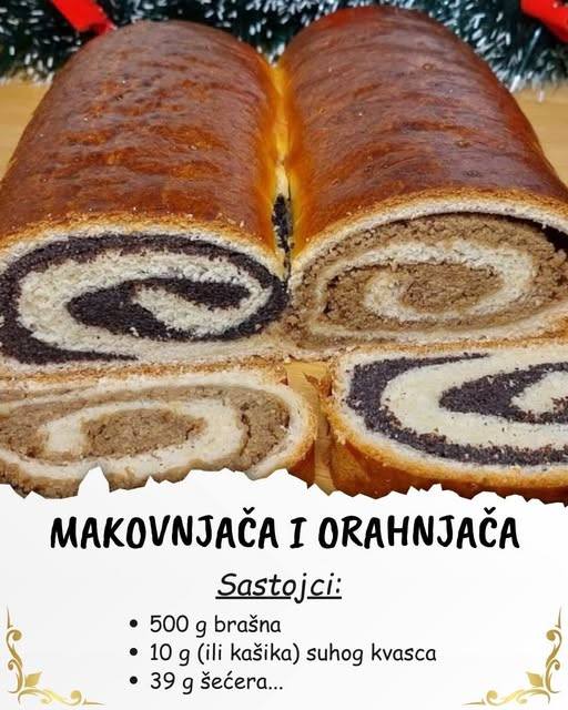 Pripremite nadjev od oraha. Alternativno, nadjev se može napraviti od mljevenog maka umjesto oraha. U posudi za miješanje pomiješajte mljevene orahe, šećer u prahu, vanilin šećer i cimet. Postupno dodajte 200 mililitara toplog mlijeka i dobro promiješajte da se sjedini. Tijesto podijeliti na tri dijela i svaki tanko razvaljati da stane na podlogu 38 x 25 cm. Preko razvaljanog tijesta rasporedite nadjev od oraha, ostavljajući rub oko 2 cm bez premaza. Zatim tijesto preklopite s kraće strane i čvrsto zarolajte.