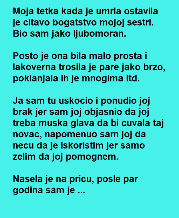 Kad je moja teta umrla, čitavo je imanje ostavila mojoj sestri, zbog čega sam bila ljubomorna.