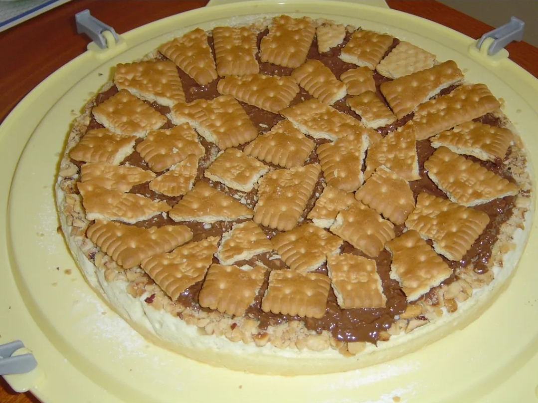 KEKSE nasjeckajte na neravne komade, ciljajući na cca 4-5 komada po biskvitu, pa ih premažite preko Nutelle. Koristite toliko keksa da potpuno prekrije površinu.
