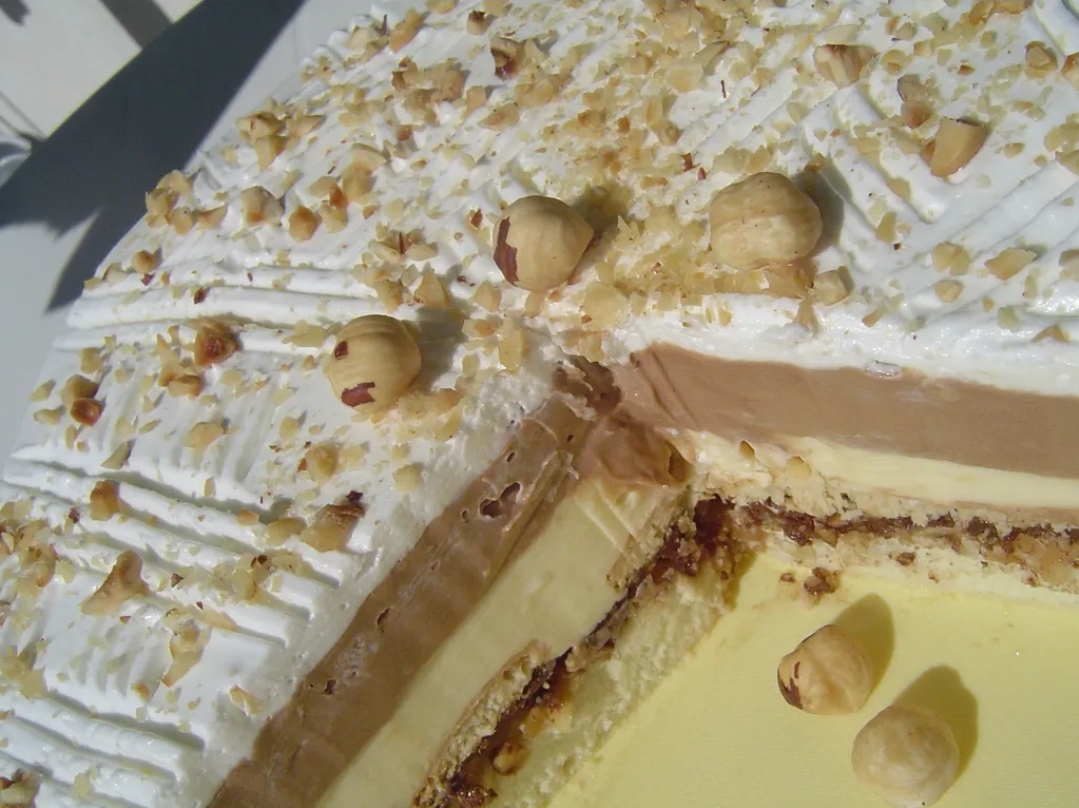Na biskvite prvo nanesite žutu kremu, zatim čokoladnu kremu, a potom tortu stavite u hladnjak da se ohladi preko noći. Kad se ohladi, lagano skinite obruč i obilato ga premažite šlagom. Slobodno ukrasite po želji; Volim posuti malo lješnjaka odozgo.