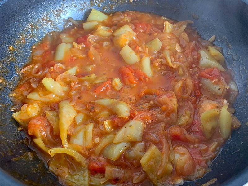Nakon što je paprika omekšala, ubacite cijeli sadržaj poveće limenke pelata (težine oko 800g, s time da same rajčice imaju oko 500g) – poželjno je da pelate sitno nasjeckate. Pustite smjesu da se kuha dok tekućina potpuno ne ispari (ili ne ostane samo minimalna količina).