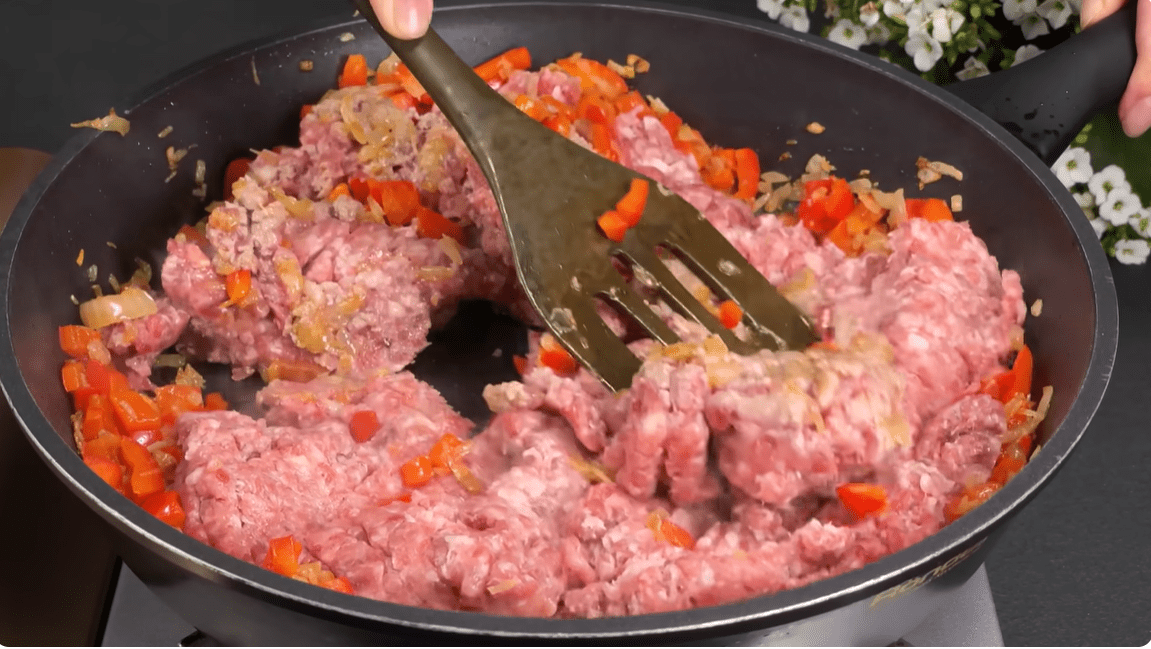 Mljeveno meso umiješajte u smjesu, pazeći da se lomi dok se kuha dok ne dobije zlatnosmeđu boju. Smjesu začinite solju, paprom i paprikom.