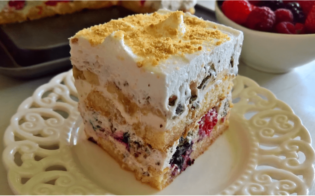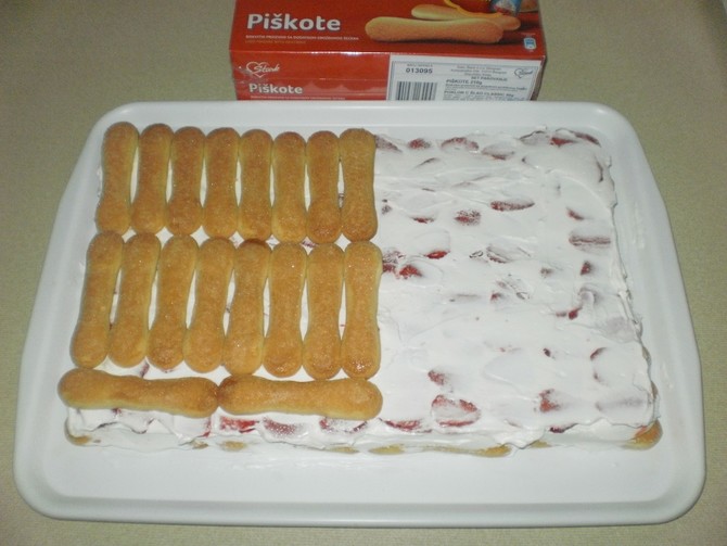 Na podlogu stavite voće po izboru, poput malina i kupina. Zatim po voću ravnomjerno rasporedite polovicu kombinacije šlaga i čokolade. Sada je vrijeme da ponovno uvedete kekse umočene u sok. Složite ih na vrh, a zatim na kekse rasporedite preostalu polovicu smjese, ovaj put od kiselog vrhnja. Na kraju posložite na sam vrh narezane banane.