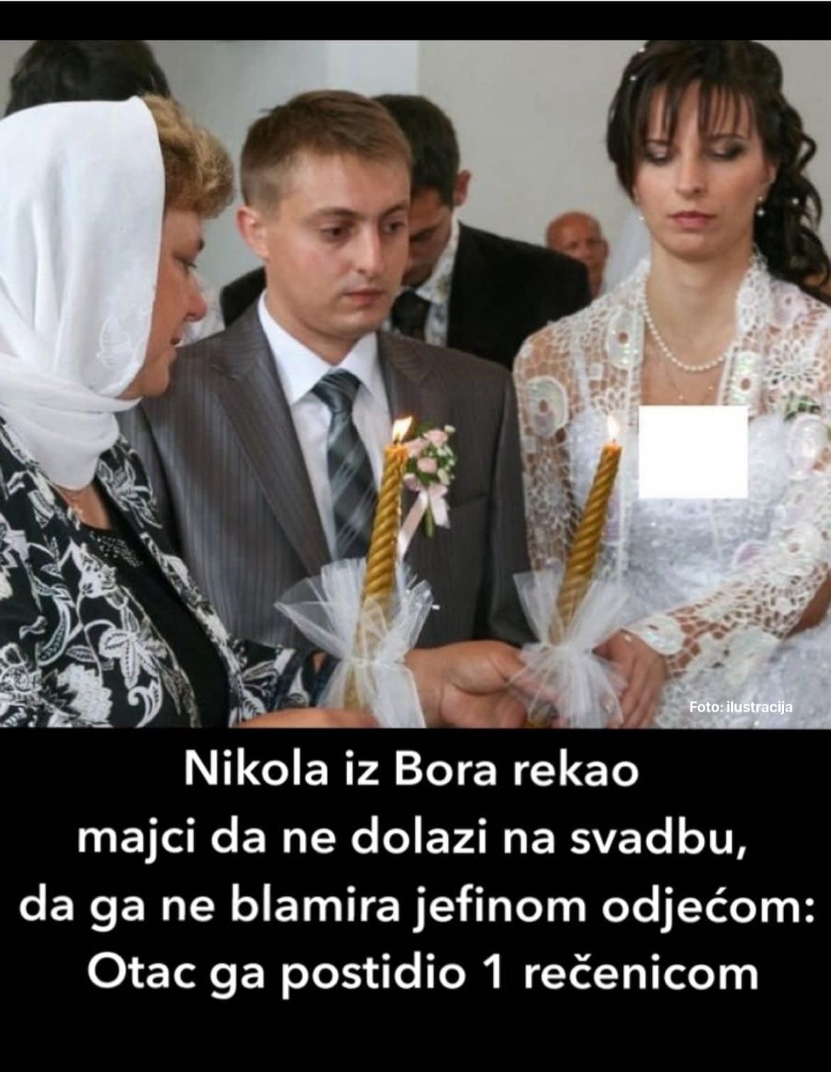 Nikola, porijeklom iz Bora, upozorio je svoju majku da ne dolazi na vjenčanje, jer se bojao da bi njena jednostavna odjeća mogla dovesti u neugodnu situaciju i loše se odraziti na njega. Na njegovu primjedbu otac je oštro reagirao, spomenuvši da je mladoženja zabranio roditeljima da prisustvuju, što je Nikolu potaknulo na sličnu primjedbu.