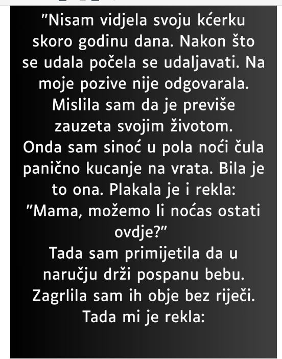 Zagrlila sam je čvršće nego ikad prije i rekla: “Ovdje ćeš uvijek pronaći dom.” Na kraju se nasmiješila.