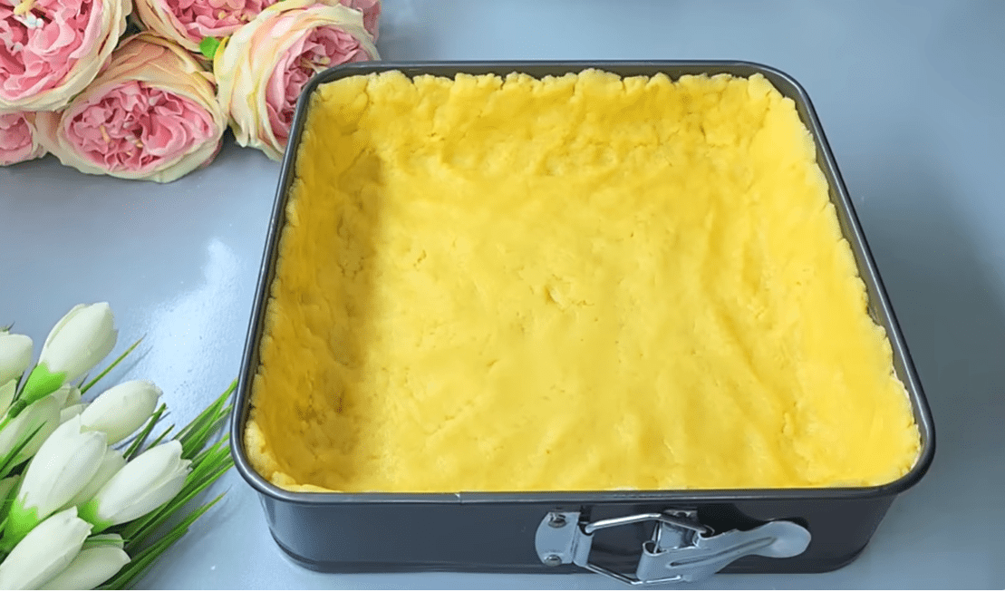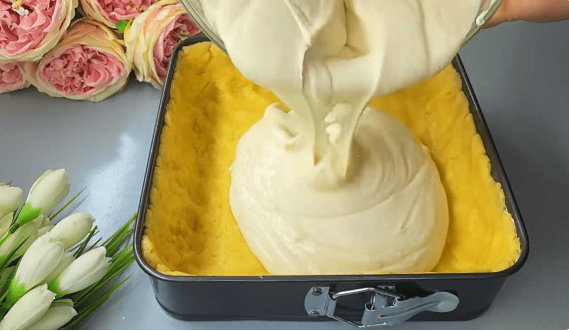 Na toplu koru lagano sipati fil. Nakon toga dodajte tropski element tako što ćete žlicom staviti ½ šalice zgnječenog ananasa na koru.