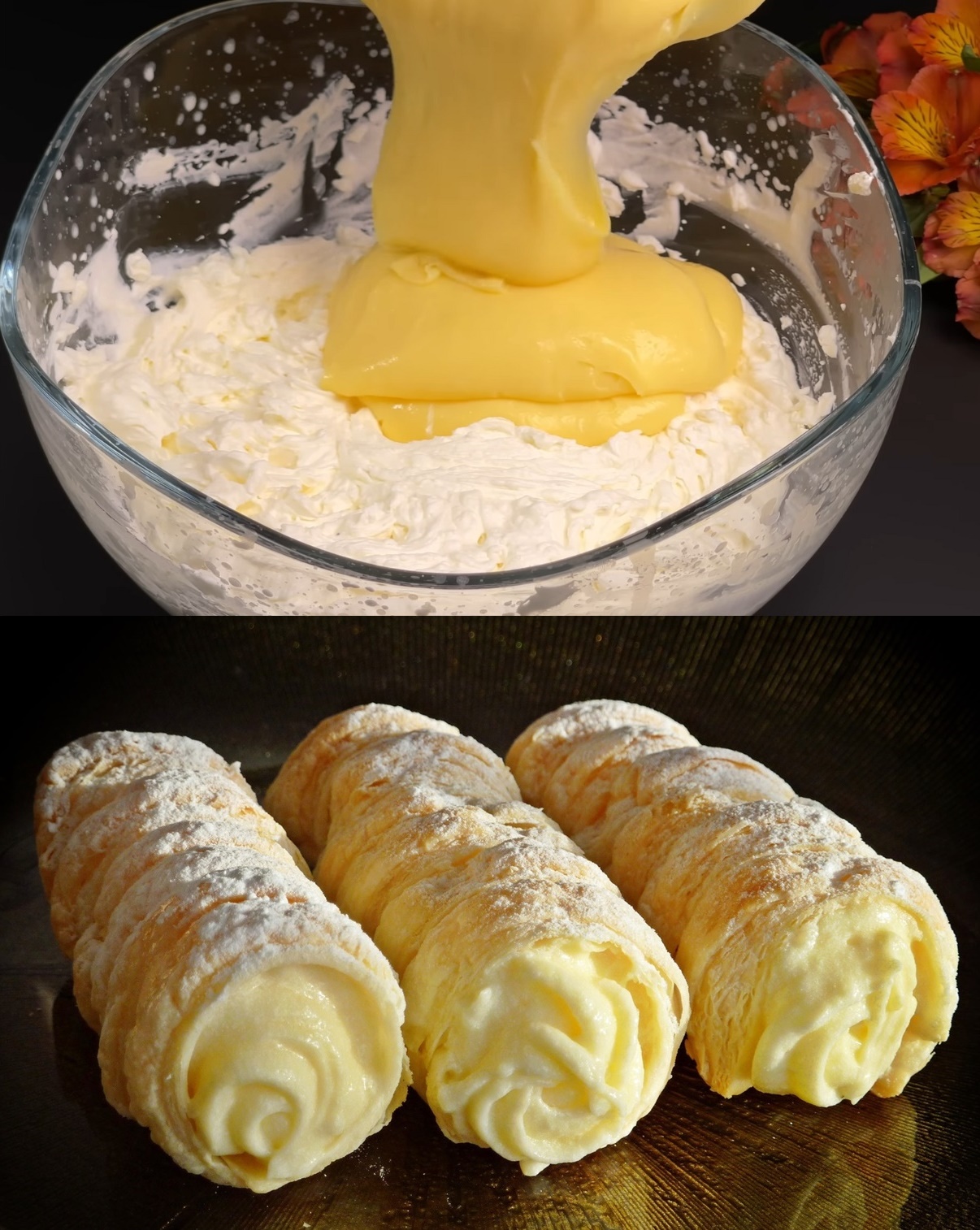 Mlijeko, ulje, žumanjke i brašno pomiješajte u glatko tijesto. Nastavite s oblikovanjem smjese u valjke. Smjesu podijelite na dva dijela i oblikujte rezance. Svaku jufku uz pomoć oklagije razvaljati što tanje, pa površinu premazati otopljenim margarinom. Smotajte jufku kao slovo i ostavite da odstoji 20 minuta. Nakon toga ponovo poravnajte oklagijom, dodatno premažite margarinom i svaku jufku preklopite još dva puta. Ovaj proces rezultira lažnim roladama. Pripremljeno tijesto razvaljajte valjkom dok ne postane što tanje, a zatim ga narežite na trakice širine 1,5 cm (jedna šarža daje otprilike 15 trakica). Trake omotajte oko kalupa predviđenih za samorolanje i stavite ih na pleh obložen papirom za pečenje. Pecite u pećnici zagrijanoj na 180°C oko 10 do 12 minuta, odnosno dok ne poprime zlatnožutu nijansu. Ponovite ovaj postupak s preostalom jufkom. Kombinirajte šećer s vodom. Snažno umutiti bjelanjke s malo soli, pa u laganom, ravnomjernom mlazu postupno dodavati kristalni šećer uz stalno miješanje mikserom. Nakon što ste dodali sav sirup, nastavite mutiti smjesu dok bjelanjci ne postignu nižu temperaturu. Šam rolice.