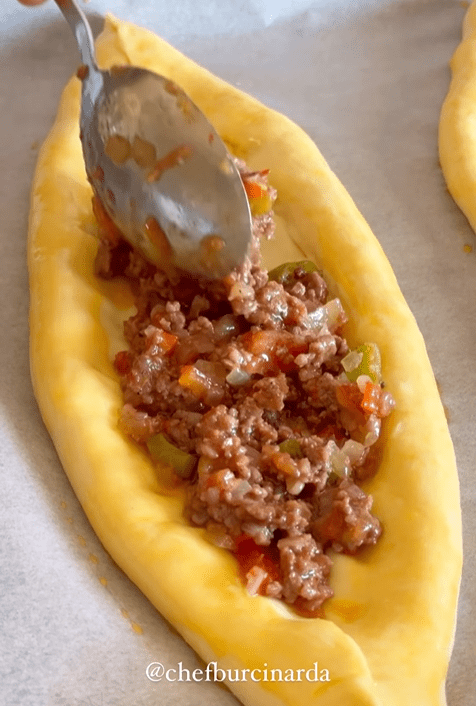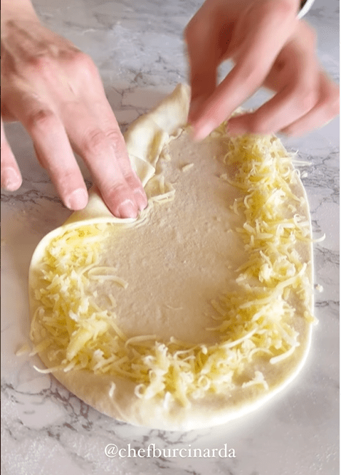 Kako biste bili sigurni da je tijesto dovoljno rastegnuto, treba ga malo proširiti, pritom pazeći na duljinu i pazeći da su rubovi jednake debljine – ne predebeli ili pretanki. Zatim premažite žumanjkom, zatim nadjevom i pokrijte cheddar sirom.