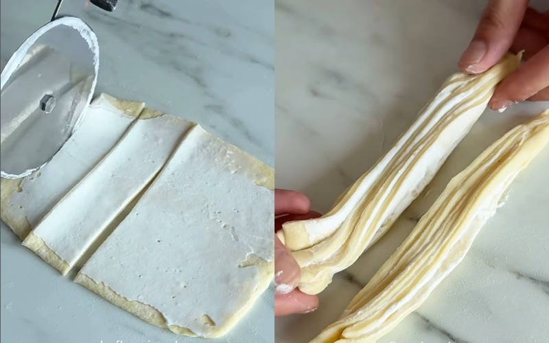 Zatim ponovno izbušite tijesto, prebacite ga na lagano pobrašnjenu radnu površinu i podijelite na 16 jednakih dijelova. Svaki dio razvaljajte valjkom za tijesto na 17 puta 14 centimetara. Tijesto podijelite na 6 jednakih dijelova i oblikujte ih kao što je prikazano u videu. Pustite da tijesto fermentira dok se ne udvostruči.