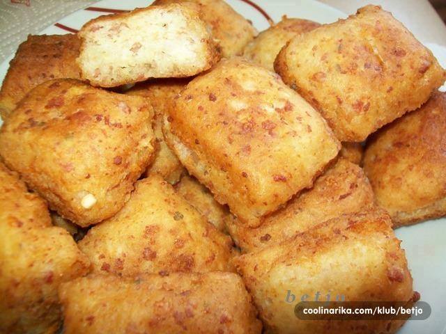 Odvojite sitno narendani sunka, kakkavalj i sir pa sjedinite. Napravite jednolično tijesto miješajući sve sastojke, a zatim ga razvaljajte. Izvadite tijesto i razvaljajte ga na radnoj površini posutoj brašnom na debljinu od otprilike 0,5 cm. Nastavite ga rezati na male kvadrate. Kockice potopiti u vruće ulje i peći ih dok obje strane ne porumene. Kad su gotovi, prebacite ih na kuhinjski papir da upije višak ulja. Bilo da se poslužuju tople ili ohlađene, ove slatke poslastice jednako su zadovoljavajuće. Uživati! 😊 Dobar tek!