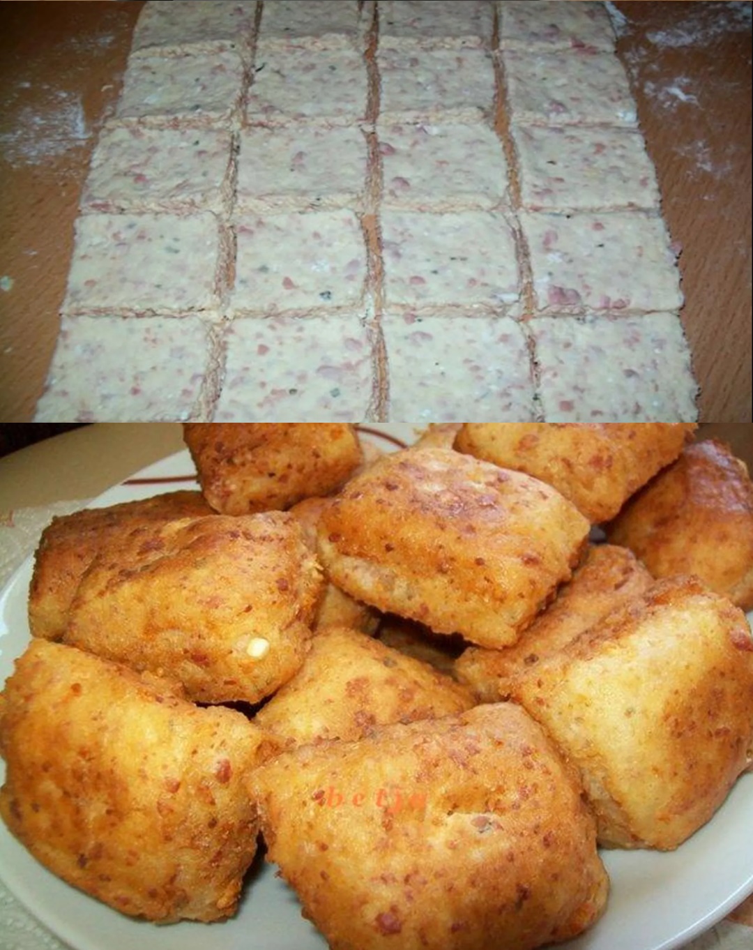 Odvojite sitno narendani sunka, kakkavalj i sir pa sjedinite. Napravite jednolično tijesto miješajući sve sastojke, a zatim ga razvaljajte. Izvadite tijesto i razvaljajte ga na radnoj površini posutoj brašnom na debljinu od otprilike 0,5 cm. Nastavite ga rezati na male kvadrate. Kockice potopiti u vruće ulje i peći ih dok obje strane ne porumene. Kad su gotovi, prebacite ih na kuhinjski papir da upije višak ulja. Bilo da se poslužuju tople ili ohlađene, ove slatke poslastice jednako su zadovoljavajuće. Uživati! 😊 Dobar tek!