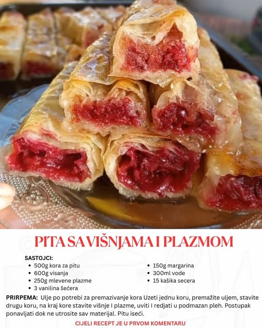 Postavite trešnje na plazma podlogu. Preko višanja oprezno staviti razvaljano tijesto jer je osjetljivo. Učinkovita metoda je rolanje tijesta na papir za pečenje radi lakšeg prenošenja. Pecite u pećnici zagrijanoj na 180 stupnjeva dok ne dobije zlatnosmeđu boju.