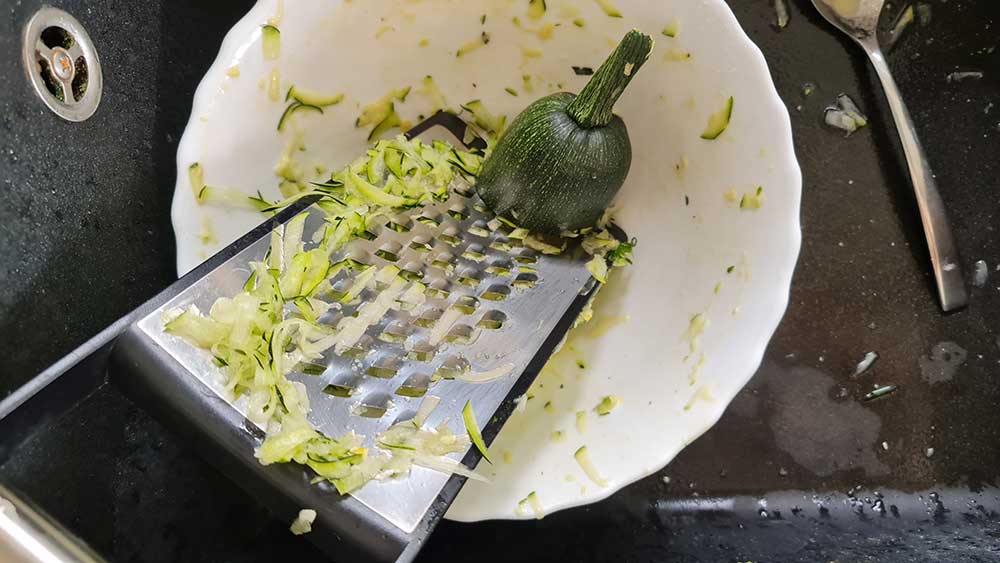 Izrežite tikvice i na sličan način uklonite višak vlage čistim ručnikom. Ovaj korak je bitan kako smjesa ne bi postala pretjerano kašasta.