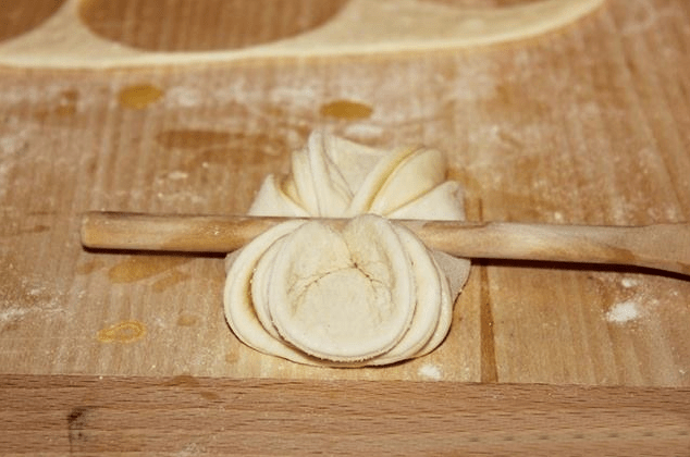 Formiranje cvjetnih oblika uključuje razvaljanje tijesta u tanki list i pomoću rezača oblikujte krugove promjera 8-10 cm. Počnite s prvim krugom, namažite ga maslacem, zatim postavite drugi krug na njega, premažite još maslacem i na kraju dodajte treći sloj tijesta.