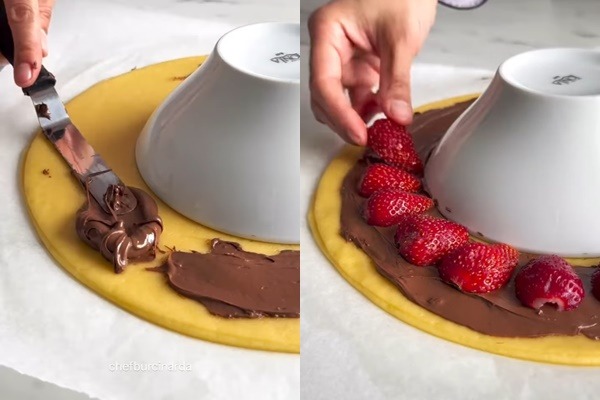 Tijesto koje ste izvadili iz hladnjaka počnite valjati između listova papira za pečenje dok ne dobijete okrugli oblik. Nakon što spojite rubove, tijesto zamotajte u prozirnu foliju i stavite u zamrzivač oko 15 do 20 minuta. Nakon tog razdoblja tijesto će biti spremno za struganje kako bi se oblikovali rubovi.