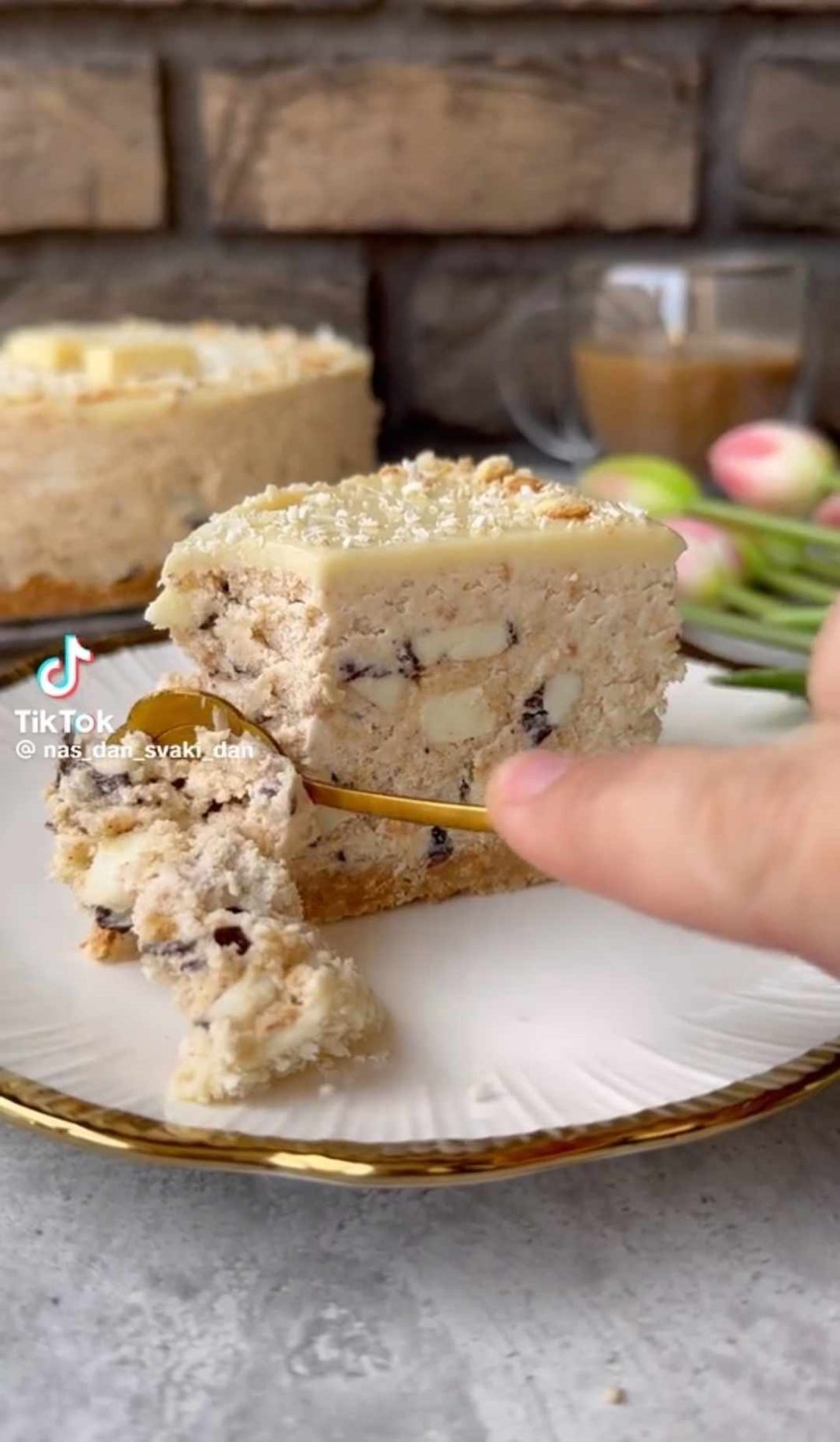 Istucite slatko vrhnje dok ne postane pjenasto pa umiješajte otopljenu bijelu čokoladu, mljevene kekse i kockice krem banana. Pomiješajte sve sastojke i smjesu ulijte u kalup.