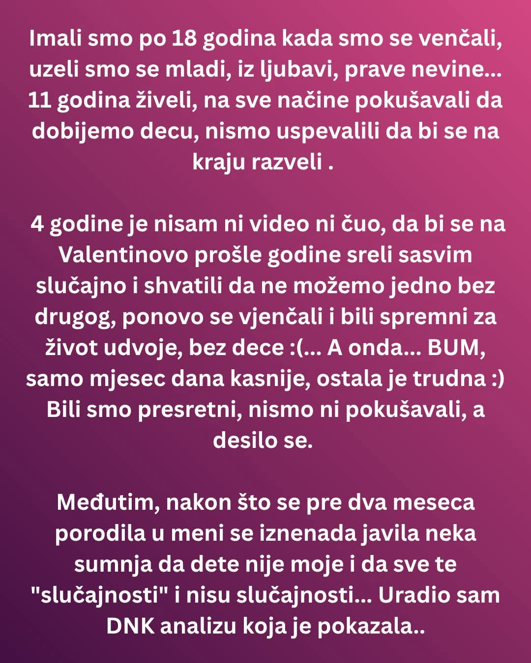 Ipak, nakon njezina poroda dva mjeseca prije, neočekivano sam počeo sumnjati u očinstvo djeteta, sumnjajući da brojne “slučajnosti” zapravo nisu slučajne. Naknadni DNK test naposljetku je potvrdio da sam ja doista otac.