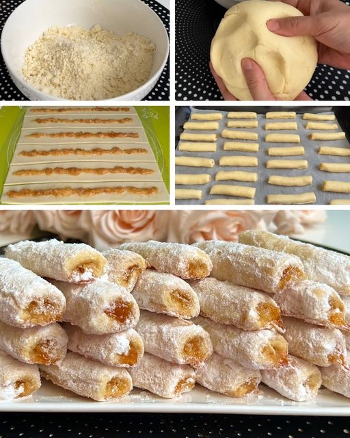 Evo odgovarajuće metode za punjenje tijesta: Započnite savijanjem tijesta prema unutra. Zatim napravite roladu koja sadrži marmeladu. Svaki kolut narežite na četiri dijela. Pecite ih na 180 stupnjeva 15 minuta. Nakon što su pečeni i ohlađeni posuti ih šećerom u prahu.