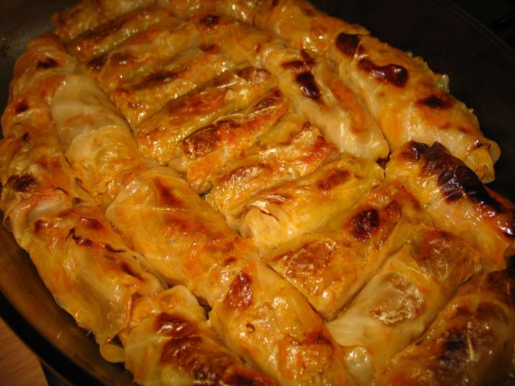 Na ulju u tavi prodinstajte nasjeckani luk i poriluk pa dodajte opranu rižu i pržite na srednje jakoj vatri dok riža ne postane staklasta. Začinite solju, crnim paprom, mljevenom paprikom i feferonom (oni koji vole blaži okus mogu se odlučiti za slatku papriku). Na dno posude predviđene za sarmu malo nauljiti i staviti sitno nasjeckani kupus iz jezgre. Na ovaj sloj rasporedite sarme. Za optimalne rezultate poželjne su manje porcije; pa sam listove rezala na manje komade i svaki punila ravnom žlicom smjese. Posudu lagano zagrijte, poklopite i stavite peći u pećnicu zagrijanu na 180°C oko 3,5 do 4 sata, pazeći da rešetka bude niže od sredine.