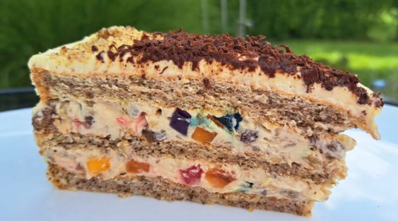 Za nadjev pomiješajte 750 ml mlijeka, 6 žumanjaka, 6 žlica šećera, 2 vanilin šećera, 5 žlica oštrog senćanskog brašna, 250 g margarina ili putera i 250 g šećera u prahu (za margarin). Dodatno u veći deo fila dodati 100 g seckanih oraha, 100 g seckanih zelenih bombona i 100 g suvog grožđa, a 1/3 fila odvojiti da ostane žut bez ikakvih dodataka.